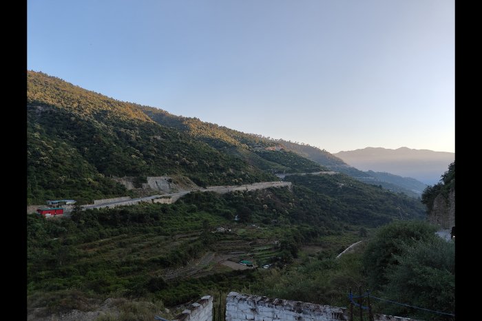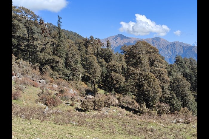 ठीक आठ बजे हैं। खुला-खुला मौसम है। पैक लंच में आलू-जीरा और पूरी लेकर हम गोई की ओर चढ़ने लगे। दोनों ओर हरे-भरे पेड़ों के समूह हैं जिनमें अधिकांश देवदार, ओक और रोडोडैंड्रोन के हैं। सामने ख़ूबसूरत नज़ारा देखकर हम रुके और फोटो खींचे। आगे एक मोड़ पर दो घसियारिनें मिलीं जिनकी पीठ पर घास की गट्ठरें हैं, आँखों में रामदाना मटर और राजमा के खेत हैं। हम पाँच-सौ मीटर ही चढ़े हैं कि देवेन्द्र सिंह ने रिरियाना शुरू कर दिया है। मैंने कहा, “देवेन्द्र सिंह जी के वज़न का और आस्ट्रेलिया में शुभमन गिल की कप्तानी का इम्तिहान है आज।”