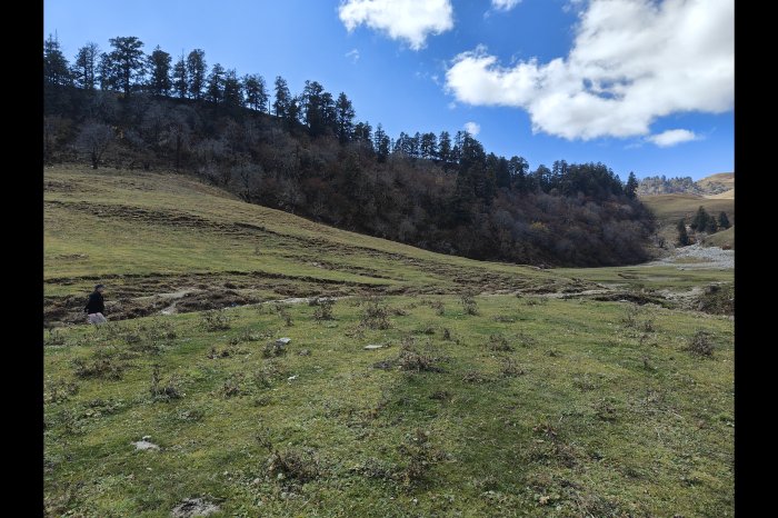 तो यह है गोई। समुद्र तल से 9800 फ़ुट की ऊँचाई पर। 20 अक्तूबर 2025 को दिवाली के दिन हम चारों पानी के स्रोत पर पेपर सोप से हाथ-मुँह धो रहे हैं। ओक, बुराँश (रोडोडैंड्रोन) और खरस के घने जंगल को निगाह भर देखकर जी में जी आया—अरे घास का मैदान कितना सुन्दर है, डेज़ी के पौधे भी हैं, वन विभाग के इगलू भी हैं।